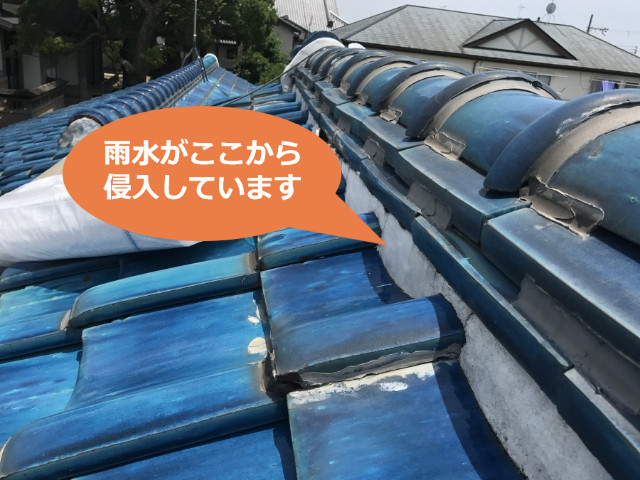 2023/03/3 日立市の瓦屋根で棟漆喰破損や鬼瓦ズレを確認!谷板金のサビも深刻