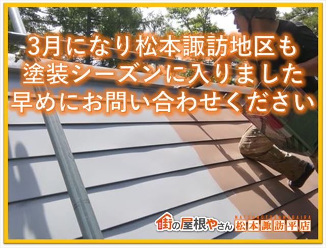 ※2023年3月6日 記事更新 こんにちは!街の屋根やさん神戸店です(*^^*)伊丹市で雨漏り点検や対策についてご検討中でしょうか?今回は弊社が伊丹市でおこなった雨漏り解消に向けた無料点検と瓦屋根の補修工事をご紹介します。プロの雨漏り点検で適切な屋根修理をし、無事雨漏り解消出来た現場をご覧ください! 関連ペー ...続きを読む2023/03/3 3月になり松本諏訪地区も塗装シーズンに入りました|早めにお問い合わせください