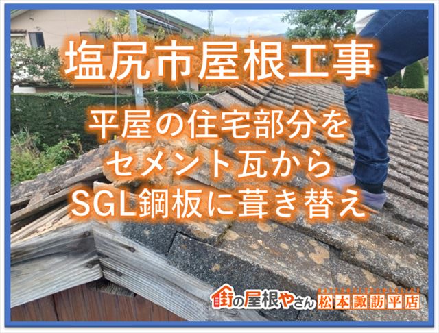 こんにちは、街の屋根やさん熊本店です。本日は熊本市中央区で飛散した棟板金の交換工事の様子をご紹介します。劣化して錆びていた棟板金は強風で一部が飛散しており、残った棟板金も飛散する可能性が高かった為、棟板金を全面的に交換しました。釘が抜けていたり、バタバタと音が鳴っている状態の棟板金は、強風に耐えられず飛散して ...続きを読む2023/02/24 塩尻市屋根工事|平屋の住宅部分をセメント瓦からSGL鋼板に葺き替え
