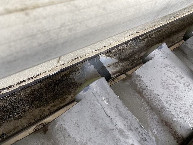 1階建ての家に隣接して2階建ての家がありその接合部に写真のステンレス製の板金がありました。横の長さが約7mありましたがこのステンレスの板金は半分ぐらいのところで継いでいました。継ぎ目にはコーキングを塗っての仕舞でしたのでそこから雨水が侵入していました。この真下の部屋に電気 ...続きを読む2023/02/2 富田林市にて3階建て建物で各所補修工事|強風被害を受けた天窓・雨樋・外壁の部分補修