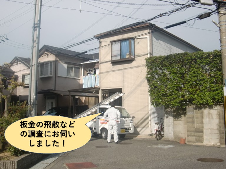 唐草板金の取り付け 多治見市脇之島町の二階建て戸建ての玄関屋根を施工中です。「雨漏りが心配…」という方も安心してください。雨仕舞いの要となる板金施工で、玄関屋根を長く安心して使えるよう仕上げました。今回は、前回からの続きで、唐草板金の取り付けからご紹介します ...続きを読む2025/10/20 熊取町のカバー工法の屋根の点検/板金が飛散していました!