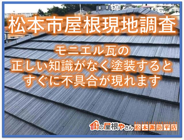 仙台市泉区のお客様宅に一年点検にお伺いしました。一年前に行ったのは、屋根の葺き替え工事です。以前に雨漏りがあった際に部分補修をしたことがあり、下地部分も傷んでいるかもしれないとのことで葺き替え工事をご要望でした。大まかに、以下の工程で葺き替え工事を行いました。①既存の金属屋根及び下葺材を撤去す ...続きを読む2023/01/10 松本市屋根現地調査|モニエル瓦の正しい知識がなく塗装するとすぐに不具合が現れます