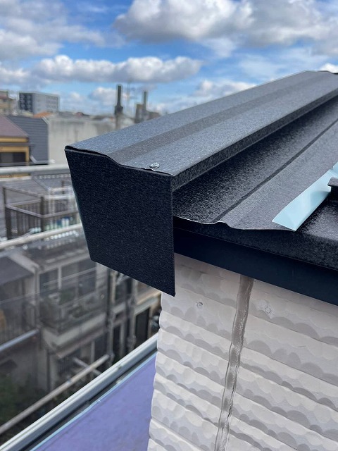 宇都宮市で横暖ルーフを貼り付け役物板金を取り付けました。 大屋根のケラバ包み板金を取り付けました。 ケラバ包み板金の軒先側にケラバキャップを取り付けてから、ケラバ包み板金下地にス ...続きを読む2023/01/21 宇都宮市の屋根カバー工事で役物板金を取り付けました。