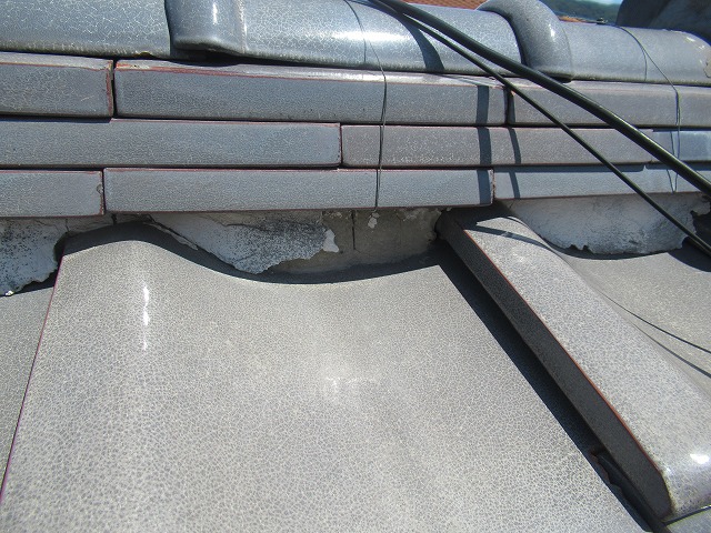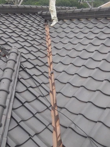 現状の写真です。 棟の部分に本来なら銅線などで緊結しているのですが、経年劣化のためちぎれて無くなっております。3段積んでいるのし瓦もずれてきていました。 屋根には勾配があり常に下向きに力がかかっています。瓦の下には屋根土がありその土と瓦がくっ ...続きを読む2022/12/24 大阪市鶴見区 玄関入り口の御影石に滑り止めクリアグリップの工事をしました。