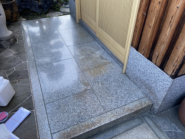 工事前の現状写真です。 玄関の上にはひさし屋根がありますが、吹き降りの雨などで石の上に雨粒があります。また石の表面に隣の植木が映り込むように鏡面仕上げでピカピカに光っています。施主様も扉の前などにマットなどを敷いて対策をしておられましたが、美観的な面も考慮して風合いがあまり変化しなくてなおかつ ...続きを読む2022/12/24 北名古屋市で塗装を検討中のお客様宅へ現地調査に伺いました