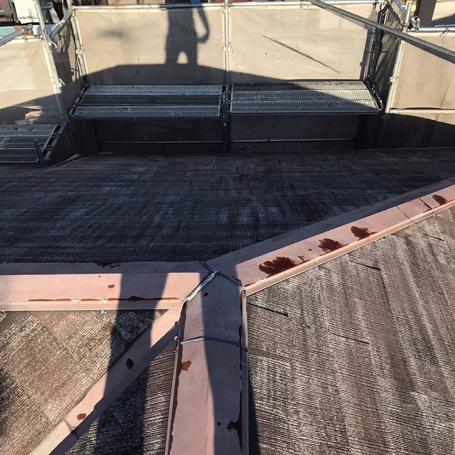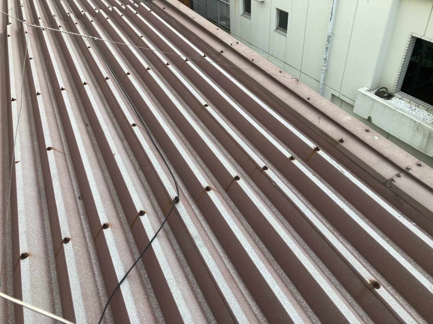 建物は5階建ての寄棟。カラーベストからスーパーガルテクトのフッ素への葺き替え工事です。(カバー工法)5階建てではありますが、勾配的には作業し易いです。いつものウインチ(昇降機)は ...続きを読む2022/12/17 葛飾区新小岩にて訪問業者より指摘を受けた瓦棒葺き屋根の調査を実施