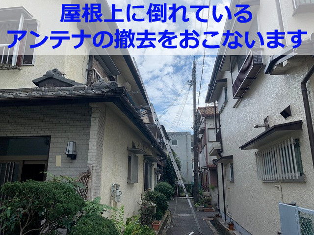 「室内で雨漏りしていて困っている。原因が分からないので一度、調査してもらえませんか?」摂津市にお住まいのお客様から上記のようなご相談をいただき、屋根工事にて雨漏りを解決させていただきました。そして、屋根工事の際に設置した足場を有効活用し、外壁~ビルトインガレージまでの塗装工事もおまかせいただくことに。ビフォー ...続きを読む2022/11/6 池田市 屋根上のアンテナ撤去!強風で倒れたアンテナの撤去をおこないました