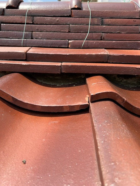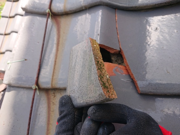 日進市で屋根の点検をしていました。点検のきっかけは漆喰の劣化が気になるとの事でしたので屋根の点検をする事になりました。漆喰の調査をしていた所、上の写真の様に瓦に割れがあることが発覚しました。割れた断面を見るとコケが生えていたので最近の割れというよりかは少し時間が経過した感じでした。この後にも出 ...続きを読む2022/10/23 ボロボロと落ちてくる漆喰きになりませんか?大垣市