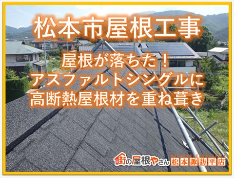 茅ヶ崎市南湖にお住いのお客様より、「屋根の一部が欠けて落下してきたので点検をお願いしたい」とのご相談を頂きました。落ちてきたのは化粧スレートの一部で、表面が色褪せている様子から塗装を検討されているとのことでした。スレートは症状や種類によって塗装が難しい場合もありますので、現地調査にて実際の状態を拝見させていただくこととなります ...続きを読む2022/10/20 松本市屋根工事|屋根が落ちた!アスファルトシングルに高断熱屋根材を重ね葺き