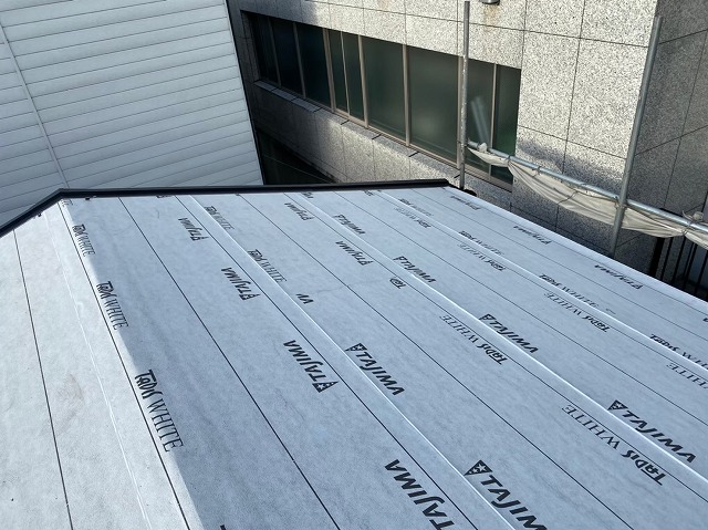 生駒市で瓦棒葺きからカラーベストへ葺き替え工事を行なっています。前回はかさ上げに勾配をつけ野地板を設置しました。今回は防水紙とカラーベストを設置していきます。葺き替え工事完了で屋根の完成をお届けします。では工事の様子をご覧下さい!! 防水紙にはケイミュー社のタディスホワイ ...続きを読む2022/09/30 生駒市カラーベストへの葺き替え工事でかさ上げから野地板を設置