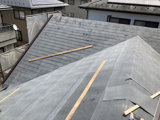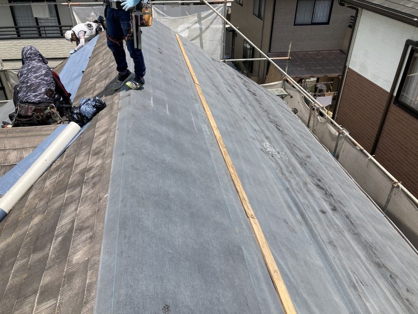 アスファルトルーフィングの施工 今回も東広島市で、老朽化したスレート屋根にカバー工法で施工を行う現場レポートをお伝えいたします。ドーマー窓の部分的な補修が終わり、いよいよ既存の屋根にアスファルトルーフィング(防水シート)を施工していきます。前回の現場の様子をご覧になりたい ...続きを読む2022/09/1 東広島市で金属屋根のカバー工法は耐震性と耐久性が高くなる!