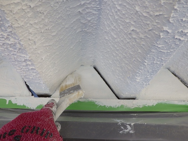 益子町で結露防止塗装のケツロナインを使い車庫折半屋根塗装の完工です。 ケツロナインの上塗り刷毛塗装中です。 結露防止塗装のケツロナインを、中塗りが乾燥したことを確認してから刷毛塗装から塗装していきます。 ローラーでは塗装できず塗り残しが出る場所に、刷毛で塗料を塗り込んでいきます。 ケツロナイン ...続きを読む2022/09/10 広島県府中市で塗装が剥がれて錆びた金属屋根の屋根葺き替え工事