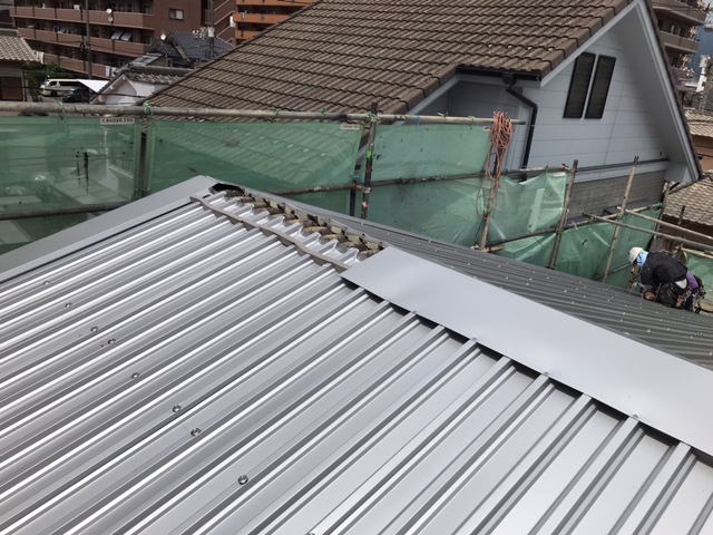 ガルバリウム鋼板の屋根材が葺き終わり棟板金と雨樋交換を行いました 今回も引き続き広島市南区の貸倉庫の現場レポートをお伝えいたします。現場の状況は、ガルバリウム鋼板の屋根が全て固定され葺き終えた状況です。屋根の最も高い部分である棟に棟板金を設置して、次の工程は、劣化していた ...続きを読む2022/08/5 神戸市長田区 瓦屋根の構造とは?下地の解体作業の様子をご紹介