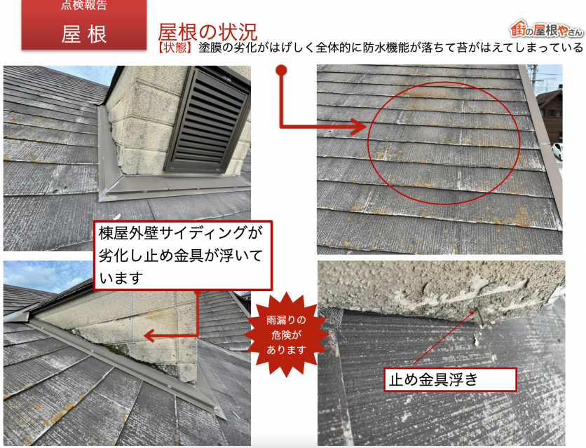 屋根点検報告書 今回も東広島市で屋根、外壁の点検作業の現場レポートです。屋根の点検と外壁の点検も一通り終了し、劣化部分の画像とその説明を掲載した点検報告書を作成いたしました。弊社では、必ず画像付きの報告書を作成し、一つ一つお客様にご理解いただけるように説明しております。 ...続きを読む2022/08/22 東広島市でチョーキングの症状が出ている外壁の点検・見積もりをいただきました