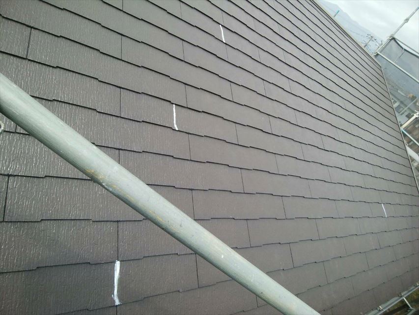 泉北郡忠岡町で前日、外壁塗装の中塗りを吹き付けとローラー工法で行いました。本日は、外壁塗装の上塗り工程で、庇や軒天井もきれいに塗装します!外壁塗装は基本的に下塗り・中塗り・上塗りと3回塗装します。下塗りの工程 ...続きを読む2025/12/1 岸和田市摩湯町のスレート瓦の屋根塗装の下塗り工程を行っています!