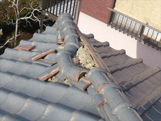 岸和田市摩湯町S様邸の破風板・鼻隠し板金巻きと屋根塗装工事の現場で前日、スレート瓦屋根の中塗りを行い ...続きを読む2025/12/1 三島市|和瓦の面戸(めんど)劣化による棟瓦崩落修繕工事 — 経年劣化が進む前の点検が大切です —