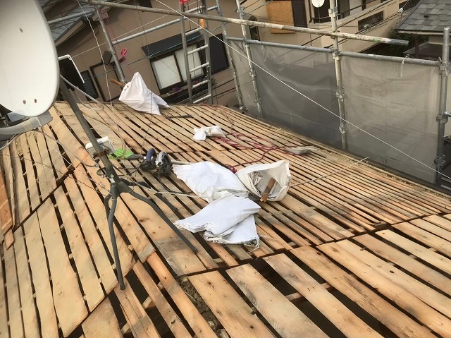 奈良市で和瓦からガルテクトへ葺き替え工事を実施しています。前回は野地板の上に補強垂木を設置し、かさ上げを行いました。今回は屋根の最重要事項でもある野地板の増し張りと防水紙の設置を行っていきます。使用した野地板や防水紙の特徴と共にご説明していきますねでは本日もよろしくお願い致します!!!!! ...続きを読む2021/05/25 奈良市で瓦を解体し、耐震性に強い屋根にリフォーム工事を行います