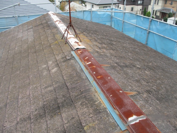 鹿沼市で棟板金交換と屋根塗装工事の着工です。 施工前のコロニアル屋根の状態です。コロニアル屋根材にコケが生えて、素地が見えない状態です。 棟板金もさびで変色して塗装しても耐久性が問題なので、撤去して新規の棟板金を取り付けます。 ...続きを読む2026/04/9 鹿沼市で積雪被害による雨樋破損の現場調査に行ってきました。