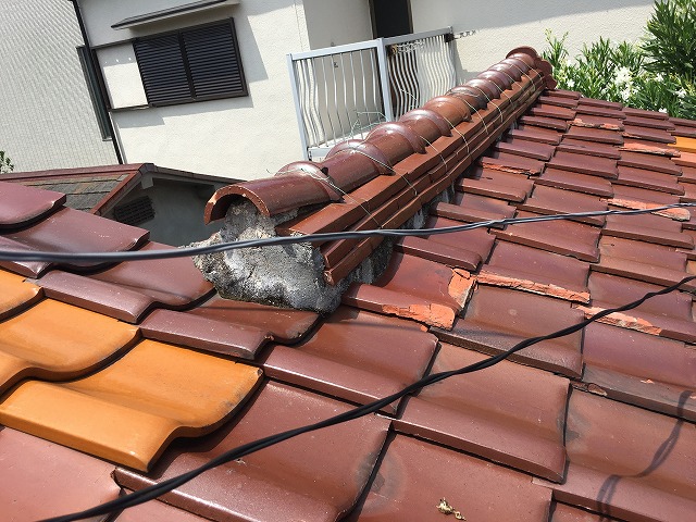 岸和田市の台風被害に遭った土葺きの屋根の修復工事です。I様邸ではいぶし瓦を使用しています。台風の突風で大屋根(一番高い屋根)の降り棟(軒先方向に向かって降りる棟)が一部崩れ、軒先の瓦も飛散してしまいました。その瓦が下屋に落ちて下屋の瓦が大量に割れる二次被害が起こ ...続きを読む2026/02/19 熊取町の劣化して剥がれてきた棟の漆喰を詰め直しました!