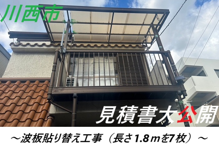 泉佐野市の陸屋根防水と外壁塗装などのご相談で、現地調査にお伺いしました。H様邸は木造と鉄骨造の二ふた棟がつながった住宅で、今回は鉄骨造の外部の改修をご検討されていました。 屋根が陸屋根(傾斜がほとんどない平らな ...続きを読む2026/02/10 川西市 【見積書大公開】 ベランダ屋根の波板に交換工事を実施!(長さ1.8m)