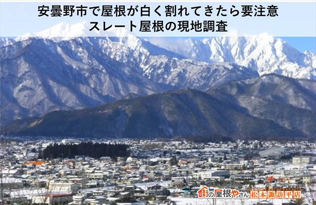 岸和田市のモルタル外壁の塗装の様子をご紹介します。K様邸はこの工事で雨漏り修理や晒し葺きの屋根の葺き替えを行いました。外壁も塗装の時期に来ていたのでこの機会に塗り替えます。外壁にひび割れがいくつか発生しており防水性能が低下していたので、先にひび割れ補修を行いまし ...続きを読む2026/02/21 安曇野市で屋根が白く割れてきたら要注意|スレート屋根の現地調査