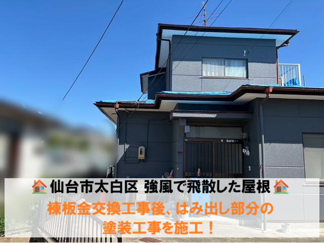 岸和田市の強風で飛んでしまった屋根の棟板金の固定工事です。S様邸は以前にも棟板金が飛んだことがあり、その時はご家族の方が修理されたそうですが、屋根の上は危険ですので今回は業者に依頼することにされました。棟 ...続きを読む2026/01/8 仙台市太白区 強風で飛散した屋根 棟板金交換工事後、はみ出し部分の塗装工事を施工!
