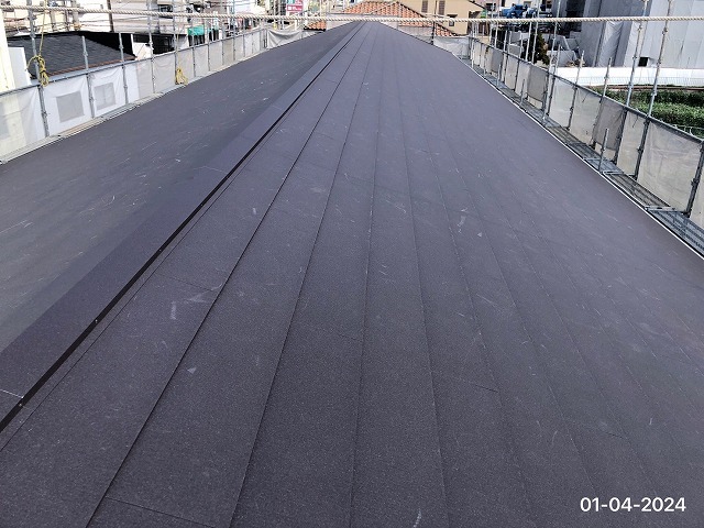 H様のハイツ物件はカラーベストが使用されていて、劣化でコケや塗装のはげも見られましたが上から断熱材付のガルバリウム鋼板の屋根材をカバー工事しましたので、綺麗になり部屋中の温度もいぜんより涼しくなりましたよ(^.^)