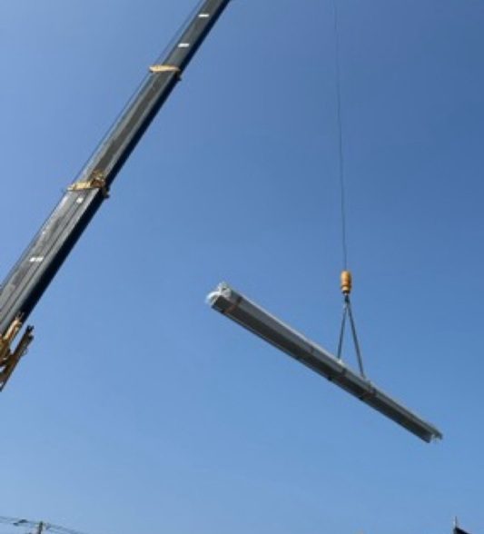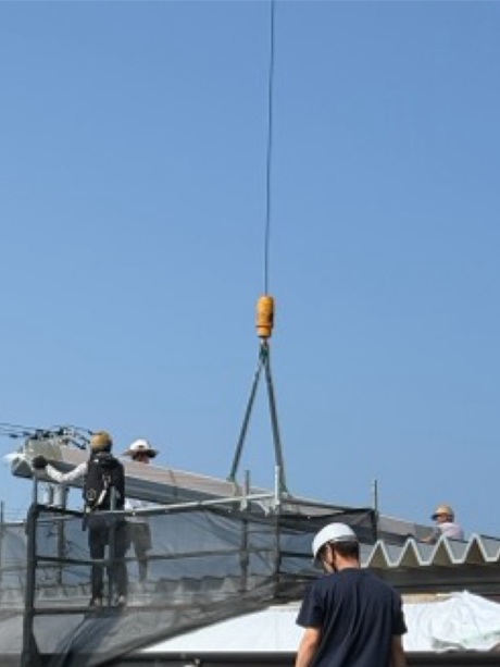倉庫の屋根の上に新しい折板を、クレーンで運びます。