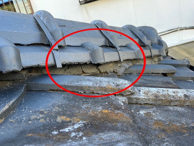 これが漆喰がひび割れ起こしてしまっている状態だよ!ひび割れの主な原因が経年劣化なんだけど、雨風や紫外線や台風・地震などの自然災害も影響が深く関係している💦そのまま放置してると、雨水が葺き土に浸水したりして、屋根の構造に問題が出てくる。最悪の場合は、雨漏りの危険性もあるから危険だよ‼️