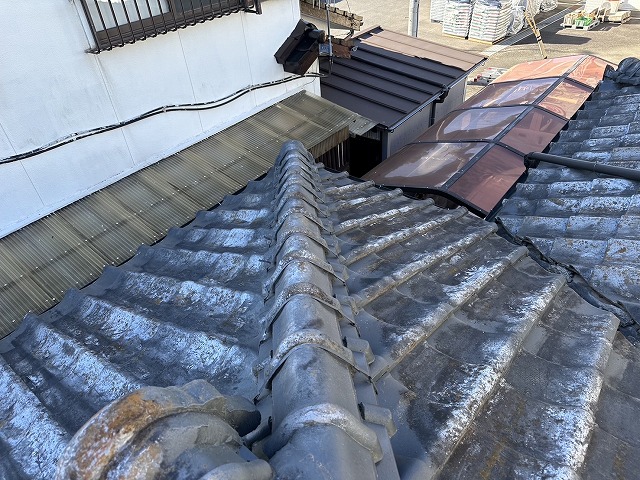 塗装の状態は、色褪せが凄く目立っている状態だった。セメント瓦には防水性が元々はないから、塗装でその防水性を機能してあげてるんだ。ただ、防水性が切れてしまったセメント瓦は雨水を吸い込みやすくなってしまって、色褪せや塗料の劣化が激しくなる💦