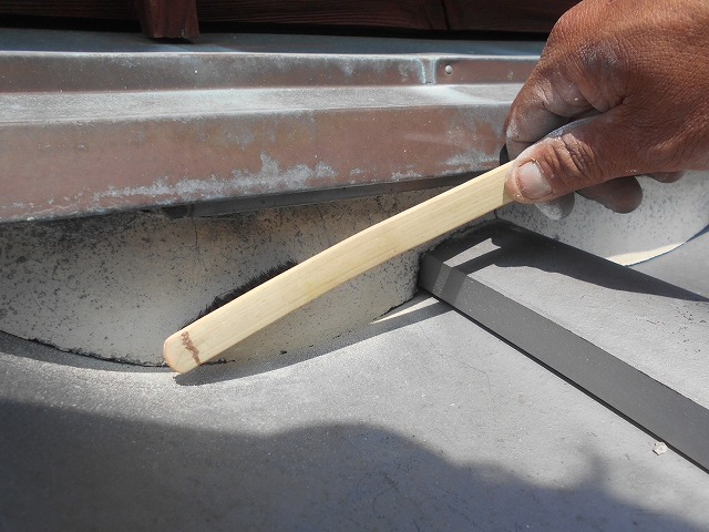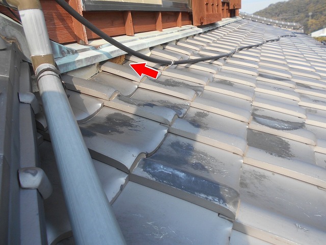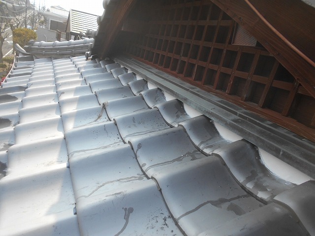 長崎市 入母屋陶器瓦屋根の1階屋根と2階壁の間の水切り板金下の雨押え漆喰補修の施工方法をご紹介!