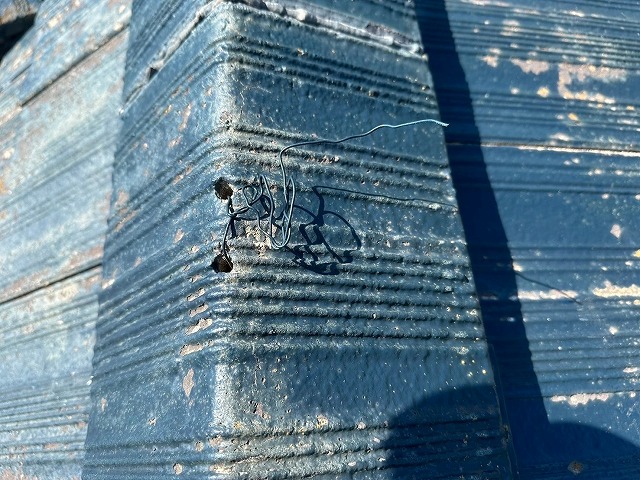 現場では、棟瓦がズレて落下しそうな状態でした。固定に使われていた銅線の針金が劣化し、緩んでいたことが原因です!また、瓦自体も経年劣化により色褪せが進み、表面には苔や汚れが目立つ状態でした。このまま放置すれば、さらなる劣化や雨漏りのリスクが高まる可能性がありましたよ!