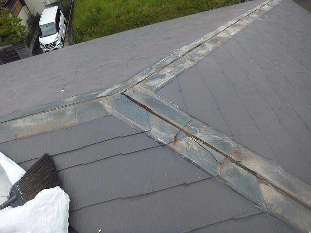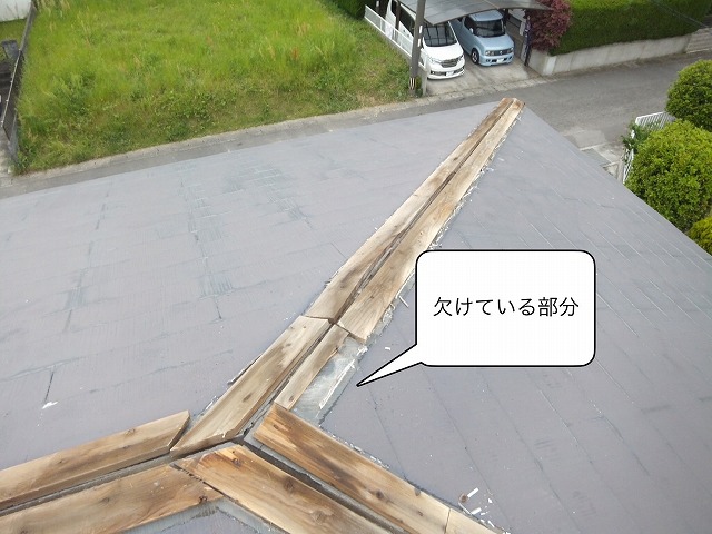次は木材を外したら、スレート自体が見えてくるよ‼️スレートもひび割れや欠けを起こしてしまってるね💦そして、このスレートの隙間が一番の雨漏りの原因になるところっ!スレートの頂点はどうしても左右の屋根の形状で向きが変わってきてしまうから隙間ができちゃうんだよね。この隙間は、屋根の内部に繋がっちゃうものだから、ここに雨水が侵入すると、内部に雨水が入ってしまって雨漏りの原因になる所だよ☔️ここをしっかりカバーする事が大事✨