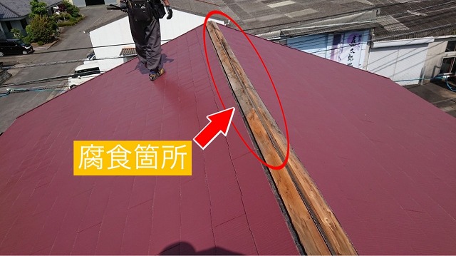棟板金を外したら下地の木材がでてくるよ!この木材に棟板金を釘で固定しているよ!なので、この木材は大事な存在。ただ、木材は湿気や雨水の影響で腐食したり、変形をしてしまう。そしたら、棟板金を固定している釘が緩みだしたりして棟板金の浮きが発生しちゃうんだよ😭