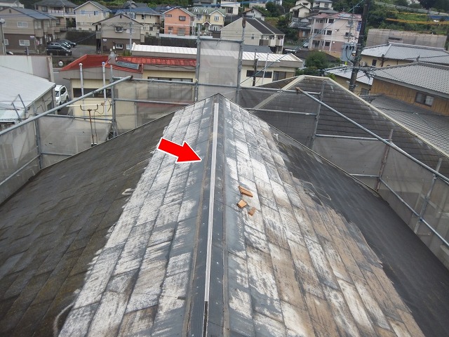 腐食下地も交換するので、外していきます!木材を外したら、コロニアル屋根自体が見えますね‼️コロニアル屋根の頂点はL字型になっており左右で屋根の形状が変わります。その場合、コロニアル自体に隙間ができてしまいます💦この隙間は「屋根内部」に繋がる隙間になっちゃう為、雨水が侵入すると【雨漏り】の原因になるよ☔️