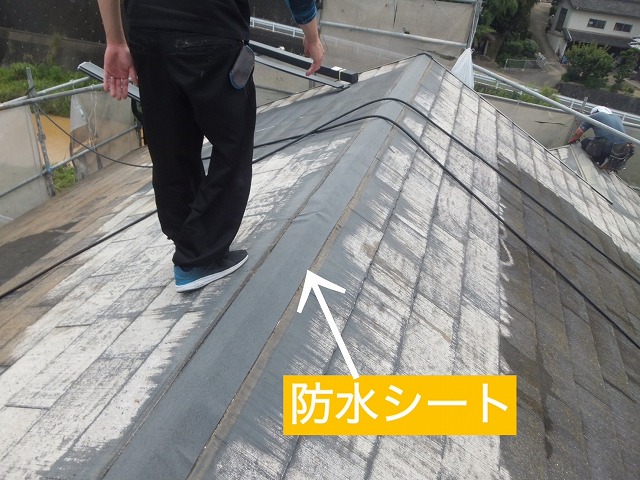 下地を貼る前に、しっかり先程の隙間を覆うように、ルーフィング(防水シート)を貼っていきます!防水性に特化しているルーフィングになるので、雨水などの侵入を防いでくれるよ‼️ただ、このルーフィングも劣化します。穴が空いたり、破れたりと状況によってはしてしまう為、メンテナンスは怠ったらいけませんよ❌