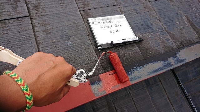 塗料を塗る前には、サビ止め塗料を塗っていきますよ!サビ止め塗料を塗る理由は、トタンがサビや劣化することを防ぐためです。サビ止め塗料を使用することで、トタンの表面を保護し、耐久性を向上させることができるからなんです(*^^*)
