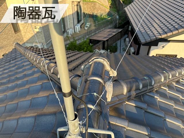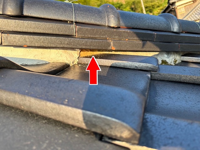 経年劣化で漆喰が剥がれてしまって土台の土が見えていますね(>_<)長年の雨風や紫外線の影響で劣化して剥がれてしまうんです。陶器瓦は、メンテナンスが必要のない瓦ですが、漆喰を使用しているので、年数が経つと漆喰補修が必要となる屋根材なんです!