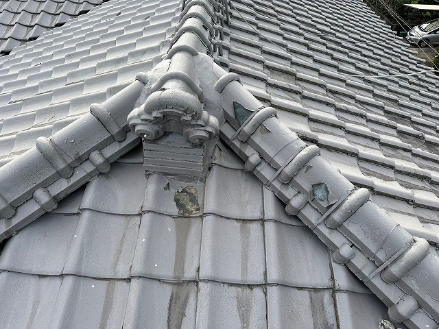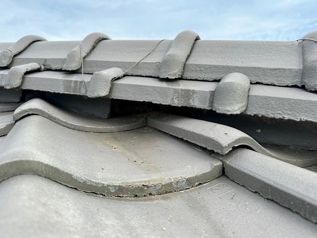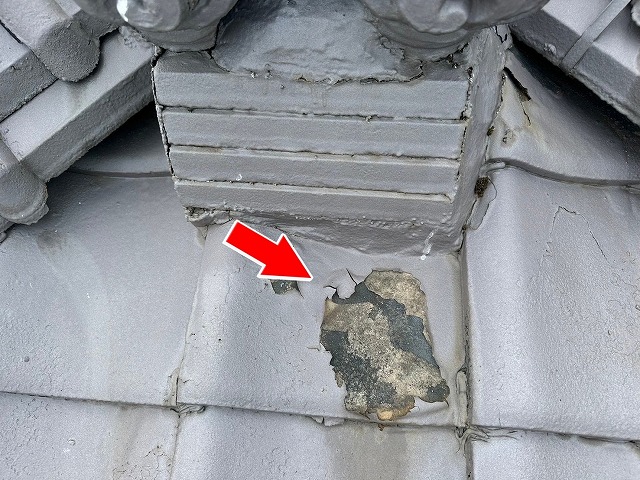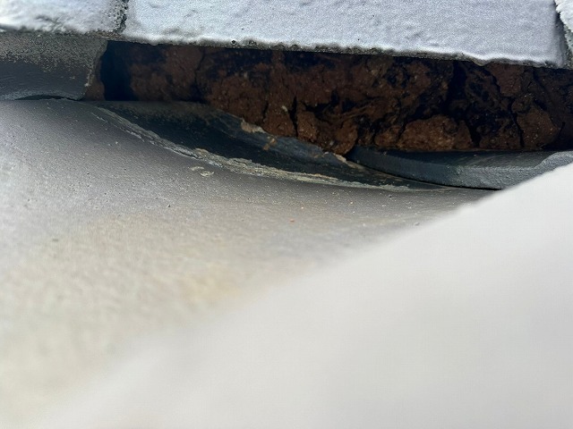 次に棟瓦の漆喰を診断していきます!!棟瓦とは、屋根の最上部で両側の瓦を結合する重要な部材であり雨水の侵入を防ぎ、屋根全体を保護する役割があります!棟瓦の漆喰は、棟瓦と瓦の隙間から雨水が侵入しないようにすること、土台の葺き土が崩れるのを防ぐ役割があります!!
