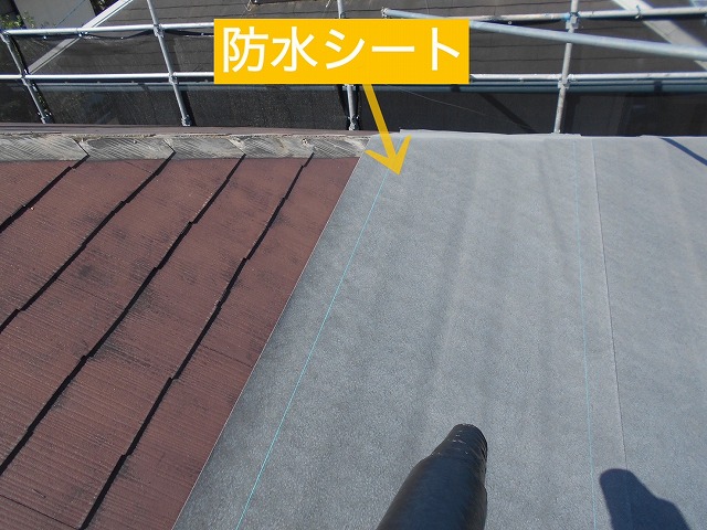 屋根全体に粘着ルーフィングを張っていきますよ!粘着性のルーフィングであれば固定作業が不要であり、作業時間を短縮することができます。屋根の特に雨漏りしやすい部分にもしっかりと密着し、雨水の侵入を防ぐことができますよ(^^)