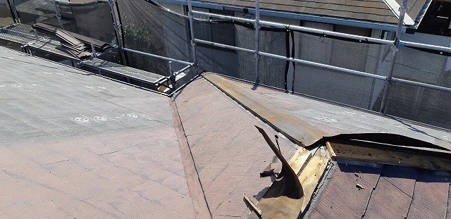 屋根部材で取り外すのは、既存の棟板金と下地です!屋根カバー工法を行う際には、棟板金と下地の木材は、屋根材の設置面が平らになり、新しい屋根材をしっかりと取り付けることができように撤去します!葺き替え工事と違い、撤去するのは部分は少なく、撤去手間や産廃費用を減らす事ができますよ(^^)