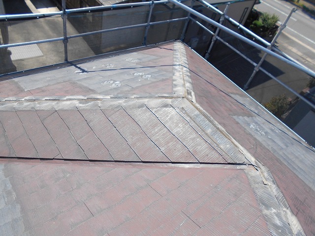 下地の木材も撤去した後は、スレート自体になります。スレート自体になると屋根のてっぺんはL字型になっており、左右で向きが異なるため、数ミリ程度の隙間が生じます。そこは屋根内部に繋がってしまうため、しっかりカバーする必要があります☝️