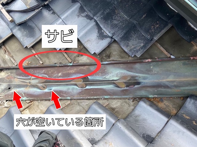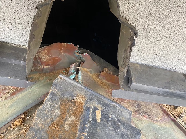 🏠物件情報🏠・築年数40年以上・中古物件・銅板に穴あり・銅樋に穴あり中古購入後から屋根の点検をした事がなかったようで、屋根の状態を見て欲しい!とのことで今回は現場調査し、施工をさせていただいたよ‼️まず、劣化が起きた谷板金を見ていこう★