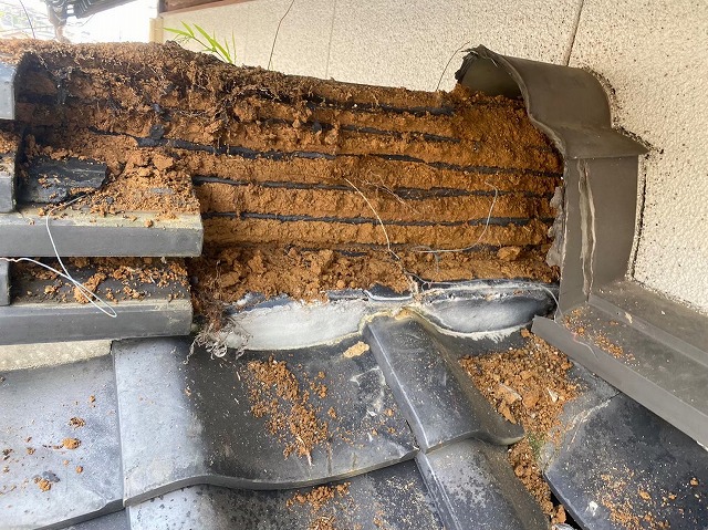 まず、谷板金を交換する場合は谷板金横にある瓦を外してからの施工になる‼️その時、棟の瓦も取り外してあげなんといけないから結構大掛かりな工事になるよ!瓦も外し、中の土台とかも全て解体した状態にして谷板金の交換を進めていくばい!!