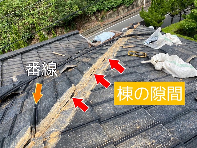 これは土も漆喰も撤去した状態!瓦と瓦には隙間が見えるよね!ここに雨水が侵入すると雨漏りの原因に😭棟瓦は【番線】で固定されとるよ!ここの番線も劣化して切れたりしたら、棟ズレの原因に😭今回はステンレスの番線を取り付けていくばい‼️