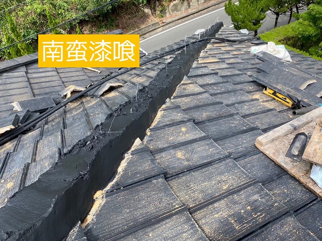 棟にある棟瓦がズレとるのが分かるね💦この棟瓦ば支えとる「漆喰」が経年劣化ば起こしてから、瓦の固定力が低下しとる状態。漆喰が剥がれて、中の土台の土が流れだしてきてしまって、このように棟瓦がズレてしまっとるとさね…このままでは、落下の危険性が大やけん早めの補修が必要よ😭そこで、今回は棟積み直し工事をオススメし、施工することになったよー✨