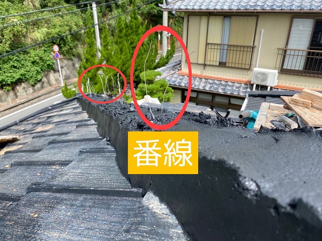 さっきちょこっと説明した、番線は最終段階の棟瓦を積み直す時に固定するけん、土台の漆喰からはちゃんと出しとくよ〜!