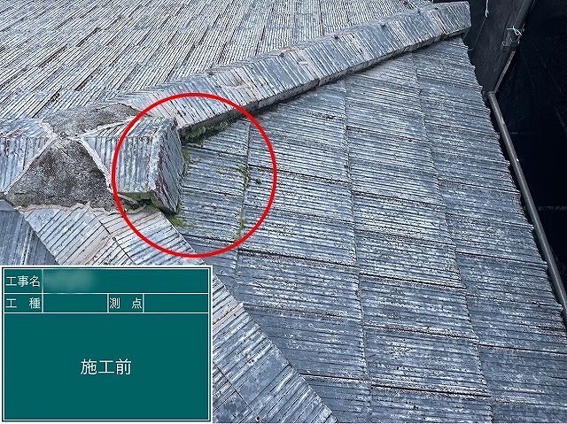 これは施工前の屋根の状態!コケやカビが付着しとるとが分かるよね💦屋根の色も色褪せしてしまっとるねー😭屋根塗装も15年前に1度施工しとるみたいけど、塗装の寿命はだいたい10年〜15年ほどって言われとるよ!お住いの立地条件などでも左右されることやけん、寿命より早めの点検とメンテナンスをすることばオススメするばい⭐️