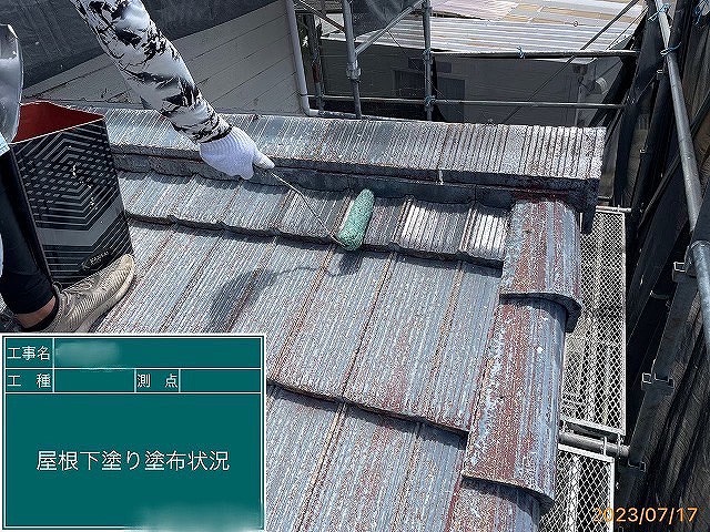 高圧洗浄が、終わったあとは【下塗り】を行っていくばい‼️➡️下塗りとは塗装で1番最初にする工程で、屋根材と塗料の密着性を向上させるもの★簡単にいうと、塗料を長持ちさせるための接着剤の役割だよ〜✨️