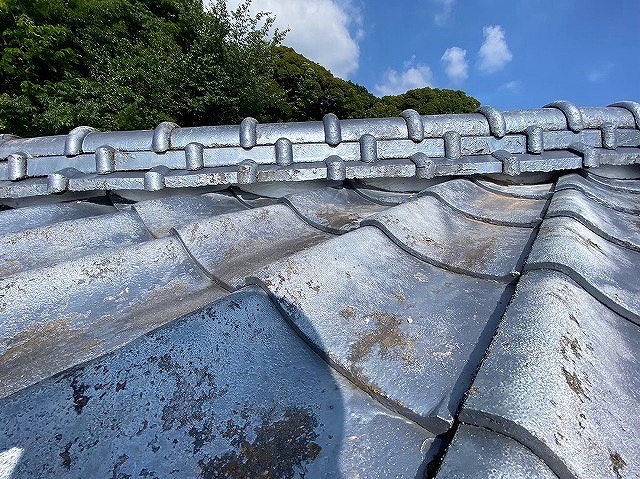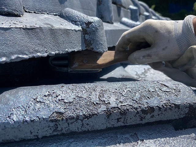 剥がれてしまっとる棟の状態はこんな感じ💦棟の土台としてある土が流れ出してきとるよね。この土台は「棟瓦」っていって、雨漏りをせんごと瓦ば何弾も積んでから防いどる所なんだけど、そこば固定するために「モルタル」で固定しとるとよ〜‼️やけん、このモルタルが剥がれてしまったら土台は固定力を失ってしまうけん、徐々に崩れていって最終的には「棟瓦の崩れ・落下」っていう危険が出てくるばい😭そうなる前に、今回は「棟漆喰工事」というもので補修していくよ〜🎶